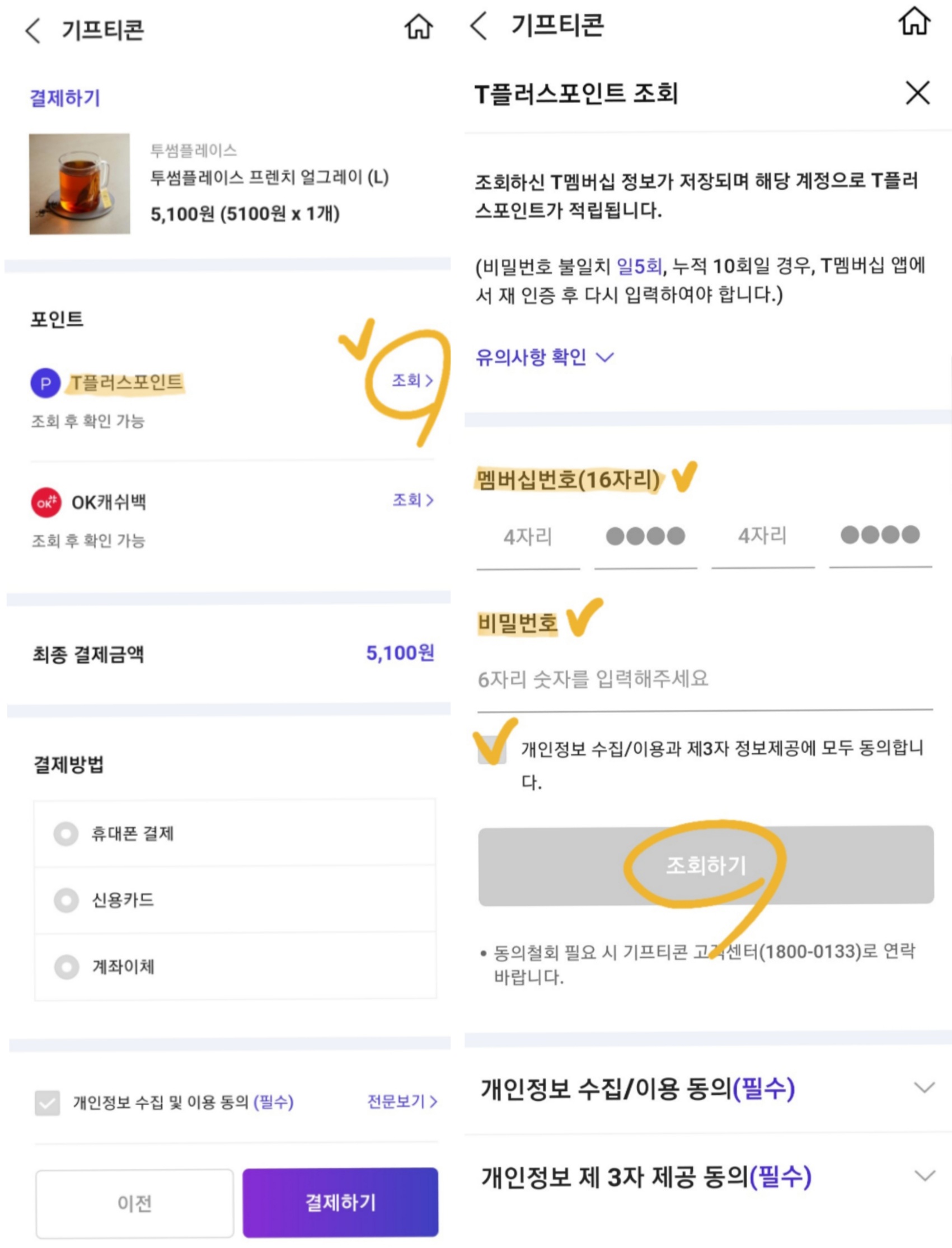 조회를 누르면 멤버십 번호 16자리와 비밀번호 6자리를 입력하라고 나오는데요. 멤버십 번호는 T멤버십 카드나 어플에 들어가면 바코드와 함께 보이는 그 16자리 번호를 눌러주면 되고 비밀번호는 앞서 언급했던 T포인트 비밀번호입니다. 개인정보 수집에 동의하고 조회하기를 눌러줍니다.