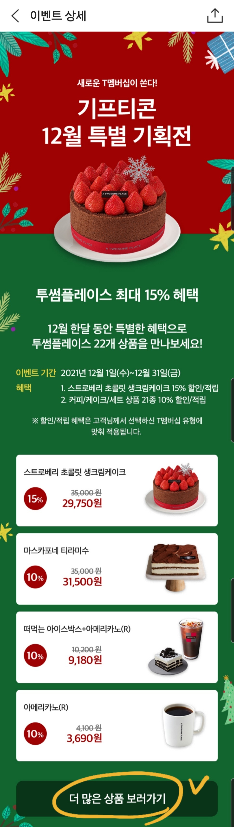 그럼 다음 화면에 '기프티콘 12월 특별 기획전'이라고 투썸플레이스 할인 혜택 설명이 보입니다. 아래로 쭉 스크롤해서 '더 많은 상품 보러가기'를 눌러주세요.