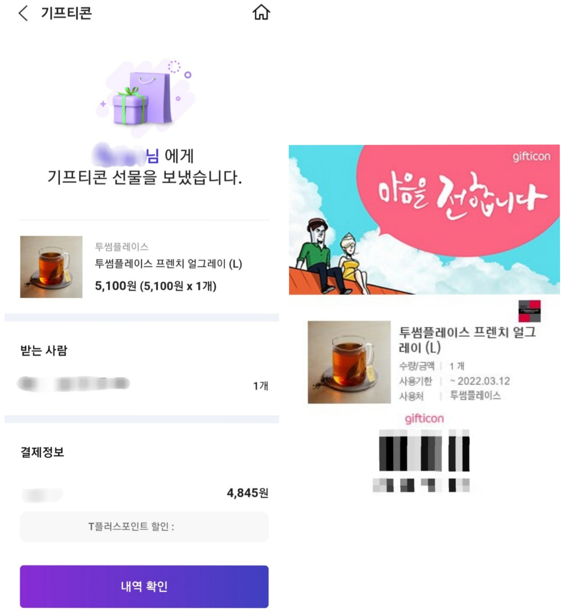 최종 결제를 하시면 내역 확인증이 나옵니다. 확인증을 받고 조금 더 기다리시면 문자로 기프티콘 바코드를 보내주는데요. 이 기프티콘을 가지고 해당 브랜드로 가서 사용하시면 됩니다.