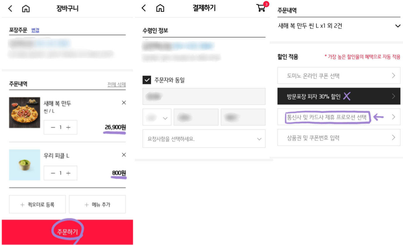 주소, 이름을 꼼꼼하게 확인한 뒤 할인 적용에서 '통신사 및 카드사 제휴 프로모션 선택'을 누릅니다.