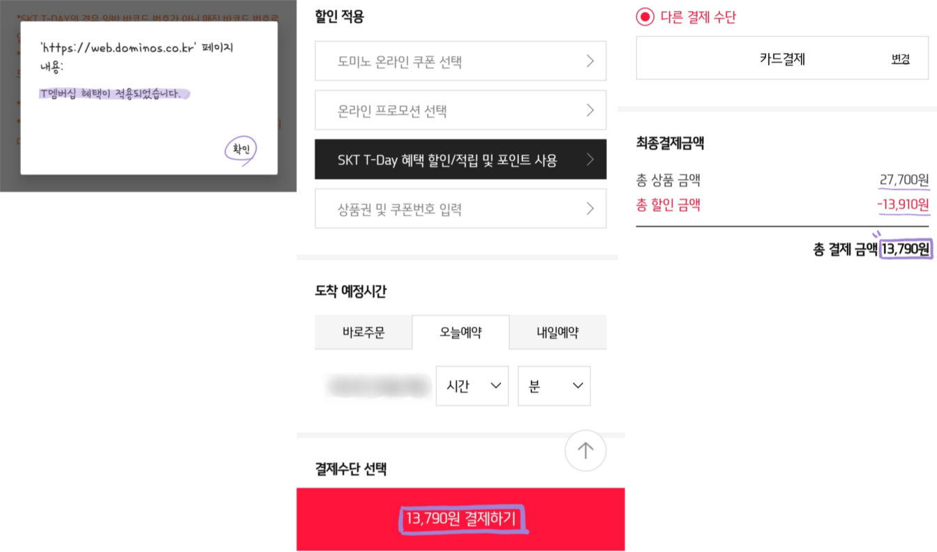 그러면 'T멤버십 혜택이 적용되었습니다'라는 팝업창과 함께 할인된 금액으로 주문할 수가 있습니다.