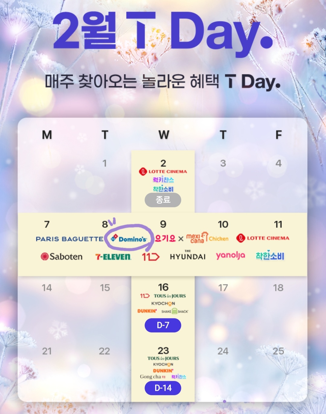 도미노피자뿐만 아니라 파리바게트, 사보텐, 11번가, 야놀자부터 요기요X멕시카나 콜라보까지 원하시는 브랜드 혜택을 받고 싶으신 분들은 지금 T멤버십 어플에서 T Day 달력을 확인하세요!