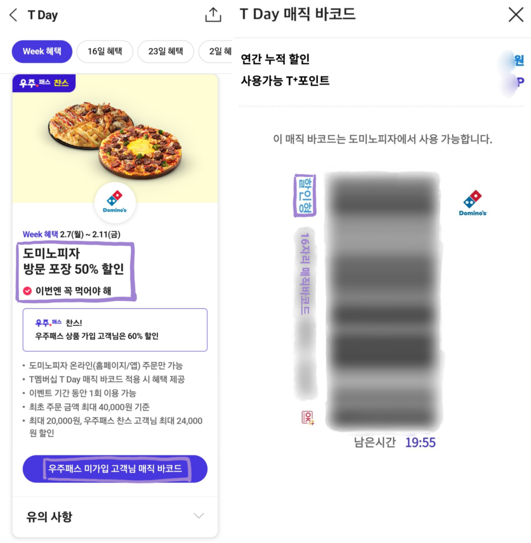 매직 바코드의 16자리 숫자는 다시 T멤버십 어플로 들어가서 해당 브랜드에서 제공하는 '우주 패스 미가입 고객님 매직 바코드'를 받으셔야 합니다. 매직 바코드를 받으시면 바코드 아래 16자리 숫자가 나오는데 그것을 도미노피자 홈페이지로 다시 되돌아가셔서 결제 진행 창에 적어주세요.