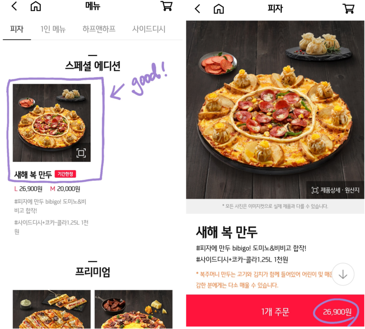 그럼 제가 먹어본 도미노피자x비비고 콜라보 새해복만두 피자 비주얼 보여드릴게요.