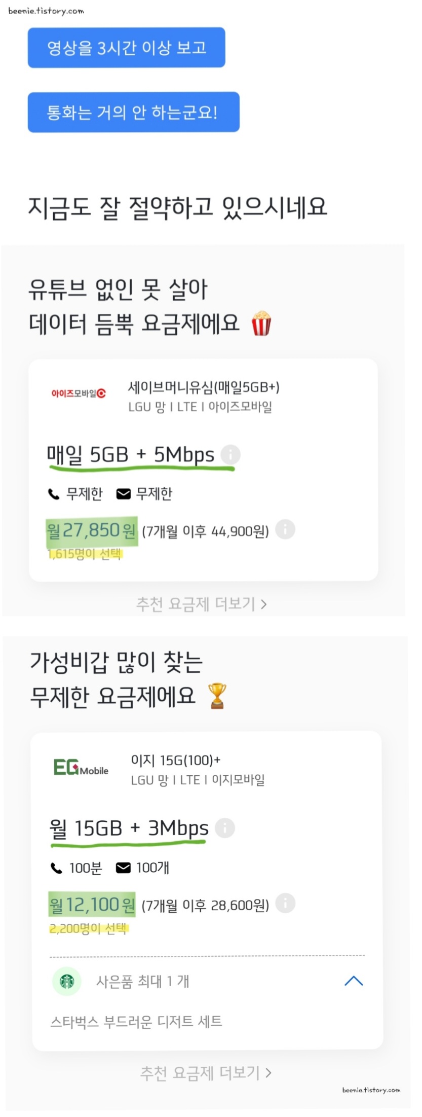 예전에 한 번 알뜰폰 요금제를 사용해보려고 시도했다가 통화품질이 너무 떨어진다, 데이터 사용할 때마다 너무 느리다 등 여러 불만들 때문에 다시는 쳐다보지 않았었는데 요즘은 그런 평이 아예 없더라고요.